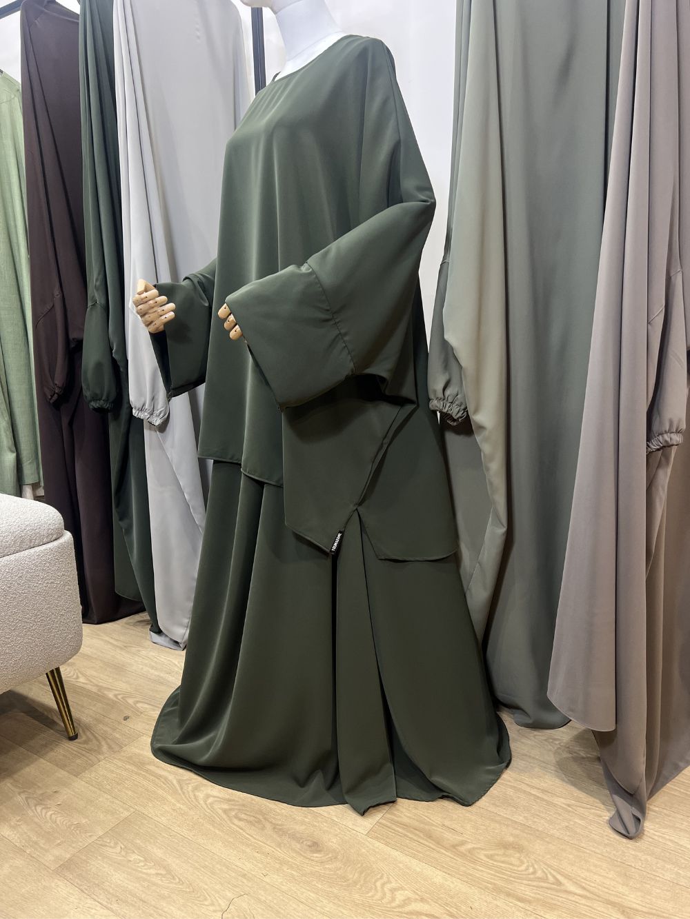 Une jupe oversize et une tunique au manches kimono doublées d’une manchette élastique pour preserver les avants bras en cas de mouvements.
